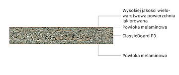 - ClassicBoard P3: Płyta wiórowa typu P3, nadaje się do celów nienośnych w obszarze wilgotnym.