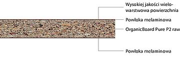 - OrganicBoard Pure P2 raw: Płyta wiórowa związana w 100 % biogennym, bezformaldehydowym klejem (OrganicGlue) z zawartością drewna z recyklingu wynoszącą około 100 %, typ P2 zgodna z normą EN 312, odpowiednia do celów nienośnych w obszarze suchym.