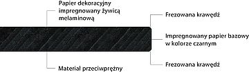 - Czarny laminat kompaktowy: Rdzeń laminatu kompaktowego w kolorze czarnym, odporny na uderzenia i wilgotność, do zastosowań o zwiększonych wymaganiach w odniesieniu do wytrzymałości.