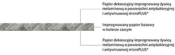 - Powierzchnie dekoracyjne i płyta rdzeniowa składają się z warstw papieru impregnowanych żywicami termoutwardzalnymi. Żywice osiągają pełną twardość w procesie produkcyjnym pod wpływem ciepła i wysokiego ciśnienia. Stają się one stabilnym, odpornym i niewchodzącym w reakcje materiałem.