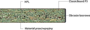 - Powierzchnie dekoracyjne i płyta rdzeniowa składają się z warstw papieru impregnowanych żywicami termoutwardzalnymi. Żywice osiągają pełną twardość w procesie produkcyjnym pod wpływem ciepła i wysokiego ciśnienia. Stają się one stabilnym, odpornym i niewchodzącym w reakcje materiałem.