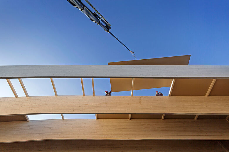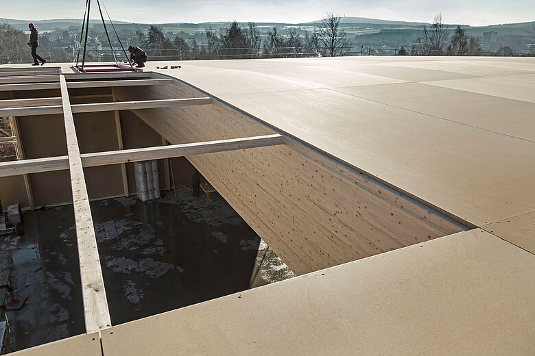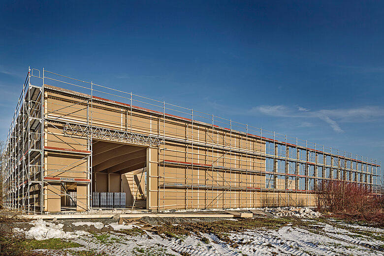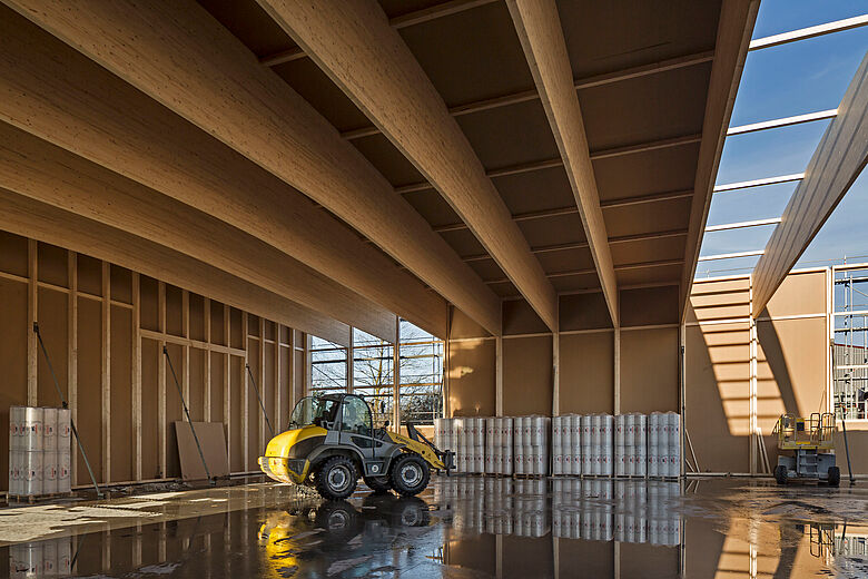 For this reason, NWS Natural Wood Solutions has specialized in various construction methods using wood both indoors and outdoors and has already implemented various projects in cooperation with Pfleiderer. The most recent joint property is a warehouse and production hall in Rehau, Bavaria. Due to the dry construction method, the building could be built within a very short time.