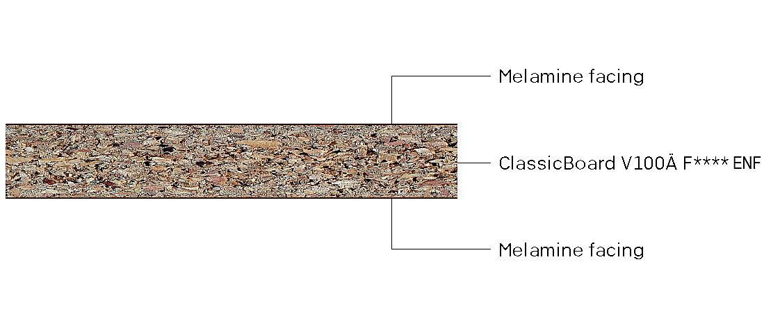 - ClassicBoard V100 Ä F**** ENF: Urea resin bonded furniture board with very low emission value and reduced thickness swelling conforming to EN 312, suitable for non-load bearing use in humid conditions.