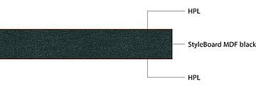 - StyleBoard MDF black: Decorative black through-dyed medium-density fibreboard (MDF), with a uniform structure.