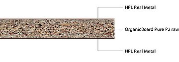 - OrganicBoard Pure P2 raw: Chipboard bonded with 100 % biogenic, formaldehyde-free glue (OrganicGlue) with a recycled wood content of 100 % type P2 conforming to EN 312, suitable for non-load-bearing purposes in dry areas.