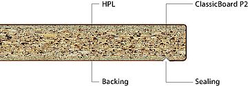 - The decorative surface and the core consists of paper layers, which are impregnated with thermosetting resins. The resins harden completely during the manufacturing process by heat and high-pressure. They form a stable, resistant and non-reactive material.